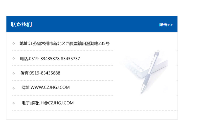 傳真:0519-83435688    郵編:213135    網址:WWW.czjhgj_com.zhongrunht.com    電子郵箱:JH@czjhgj_com.zhongrunht.com